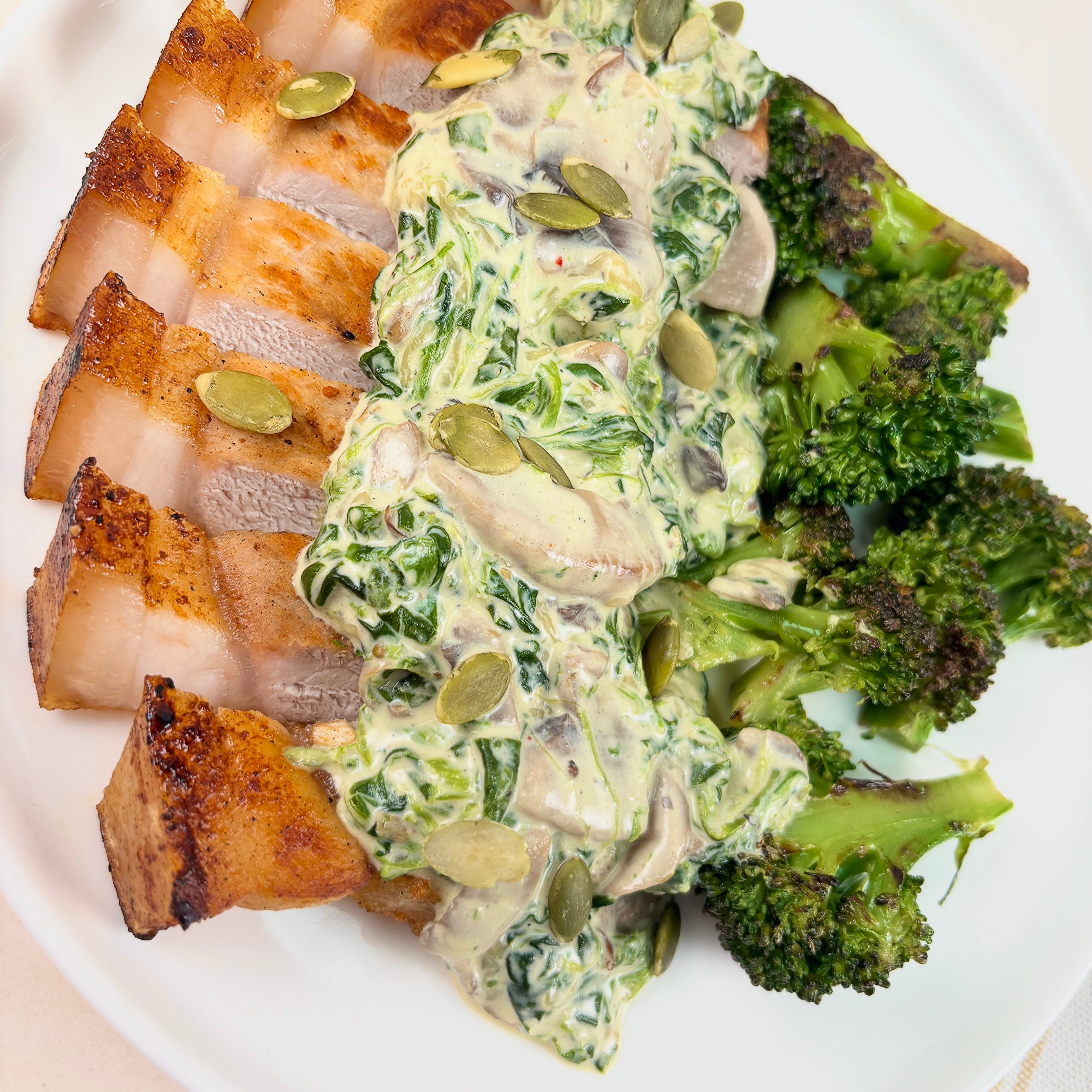 Tender, juicy pork loin chops seared to perfection and paired with a rich, creamy spinach and mushroom sauce. Finished with a side of grilled broccoli florets for a wholesome balance of flavor and texture. The smooth, parmesan-infused cream sauce and nutty roasted pumpkin seed garnish create a satisfying, keto-friendly meal that’s high in protein, low in carbs, and bursting with natural goodness
